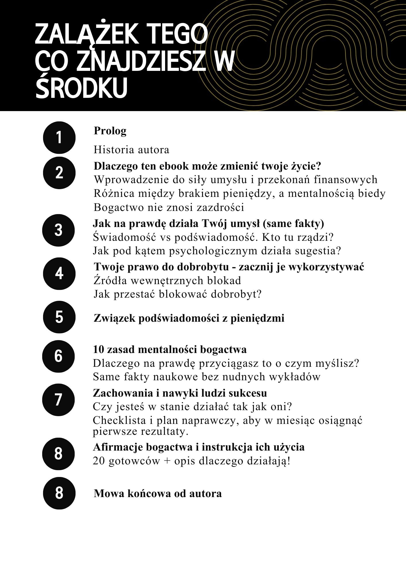 Poznasz mentalność ludzi sukcesu i nauczysz się ją wdrażać w codziennych decyzjach. Od teraz Twoje myśli, słowa i działania będą prowadzić Cię w jednym kierunku — ku wolności finansowej.