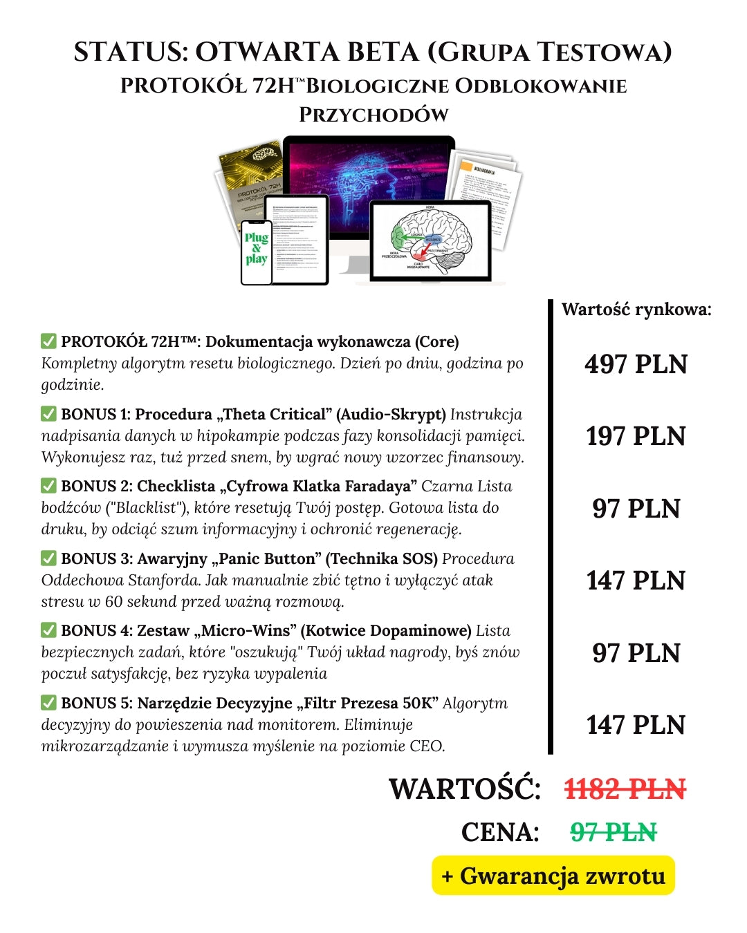 Nie kupujesz zwykłego ebooka. Dołączasz do grupy testowej Protokołu 72H™. Otrzymujesz kompletny system biologicznego resetu mózgu dla przedsiębiorcy z Kompletem 5 Modułów o łącznej wartości 1182 zł.